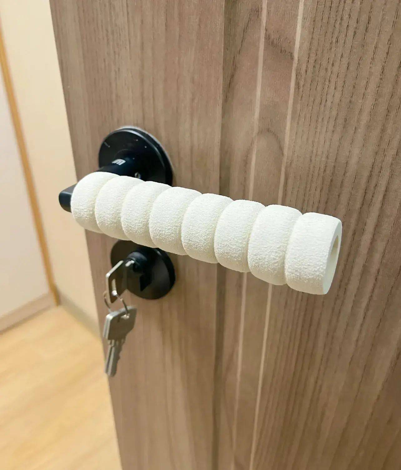 或者,还有不要钱的方式,家里闲置的毛绒玩具、毛绒发圈,往墙、锁冲突的地方一绑。