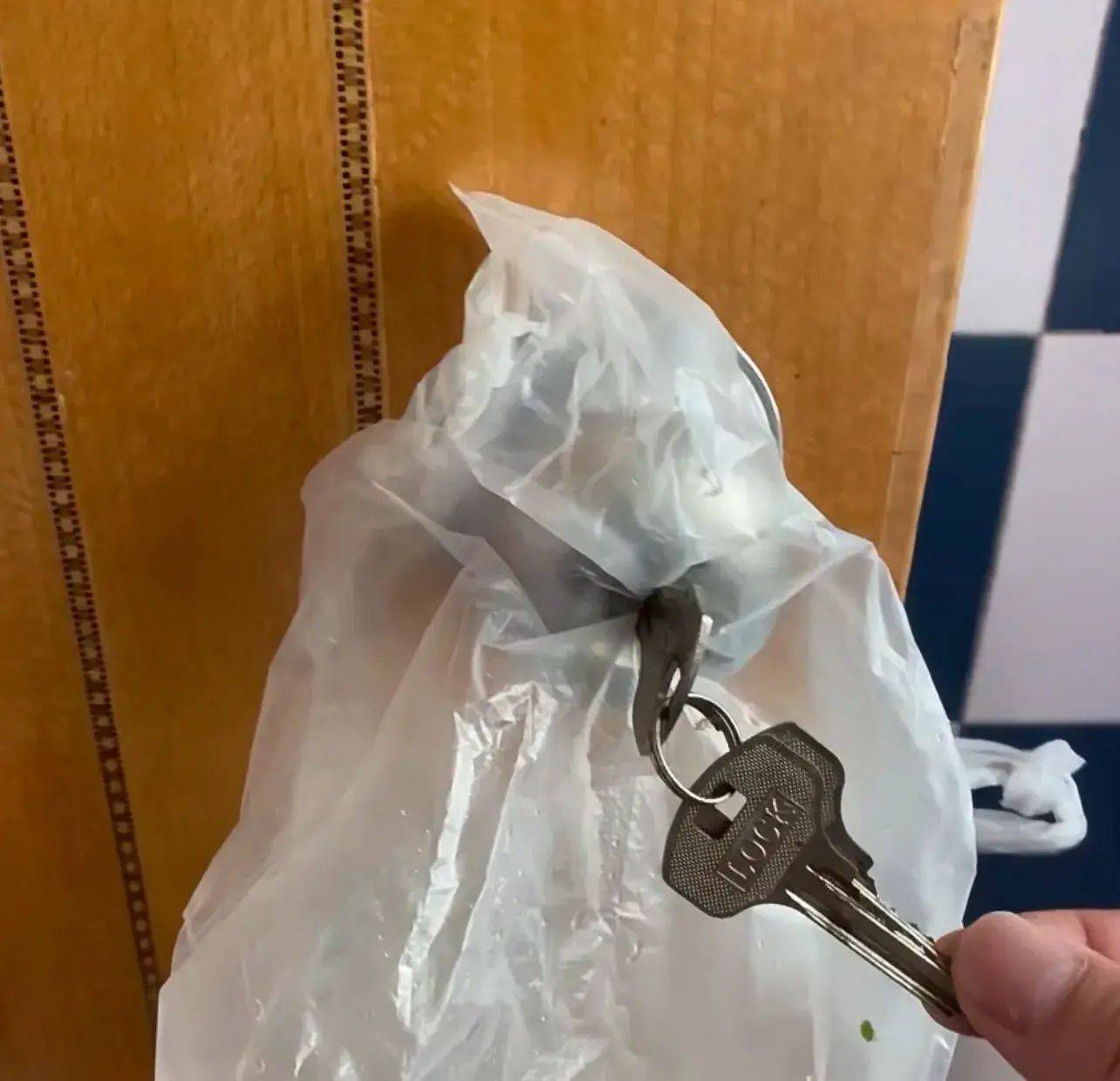 挑不容易破的塑料袋,包着钥匙往锁孔里穿,左右多拧巴几下就能开,原理咱也不知道,反正有很多人尝试成功了。